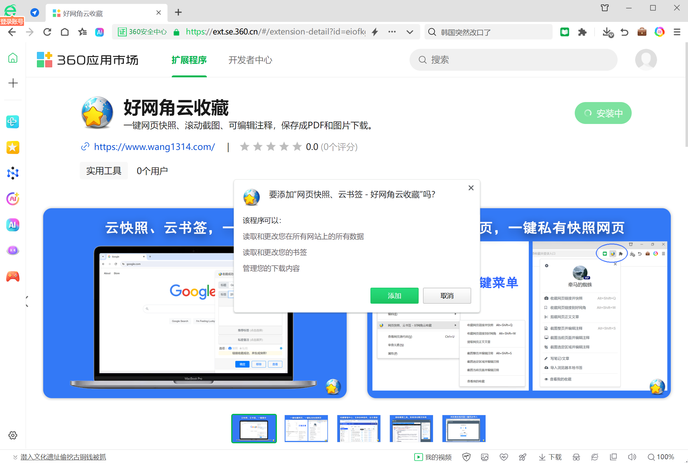 在浏览器弹出的确认窗口上,再点击“添加”,将扩展添加到360浏览器。